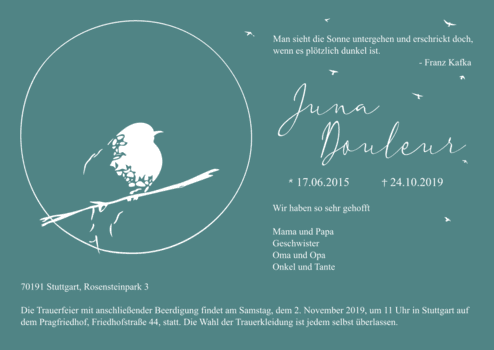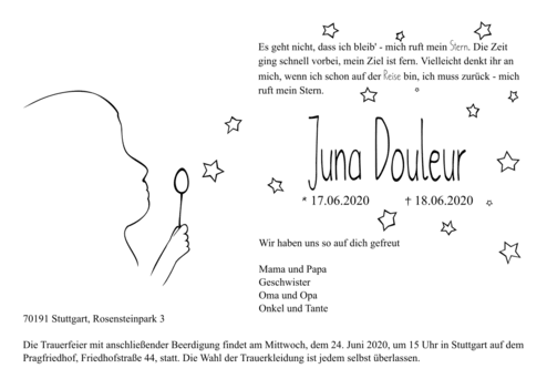 Das wollen wir ändern und erstellen Grafiken, die einen würdevollen und altersgemäßen Abschied von jungen Verstorbenen ermöglichen. Unsere Designs spiegeln - wenn gewünscht - auch den Hintergrund des Todes und somit die besondere Situation für die Familie wider: