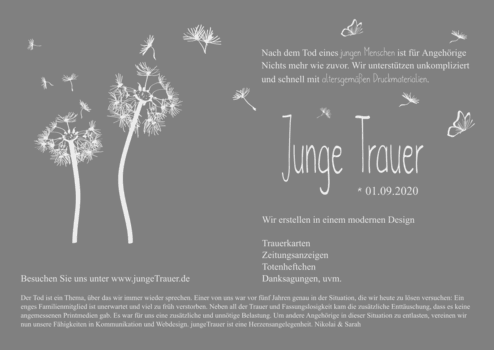 Der Tod junger Menschen ist ein Schock, da sie den Großteil ihres Lebens noch vor sich gehabt hätten - es passt nicht in unseren gewohnten Lebenslauf. Wahrscheinlich sind auch deshalb die meisten Trauerkarten für ältere Menschen gestaltet worden.